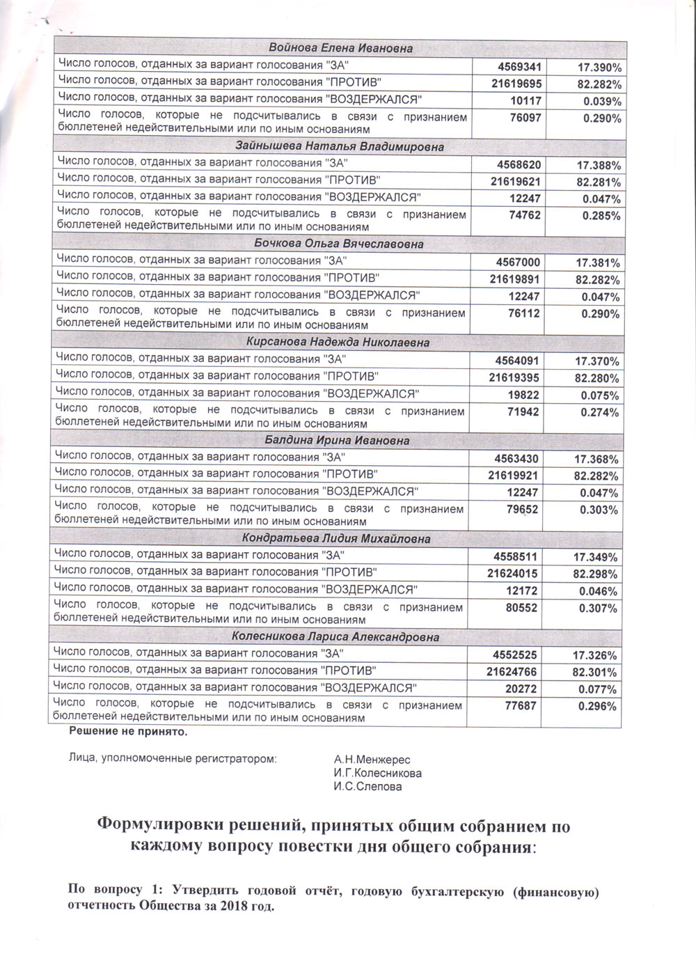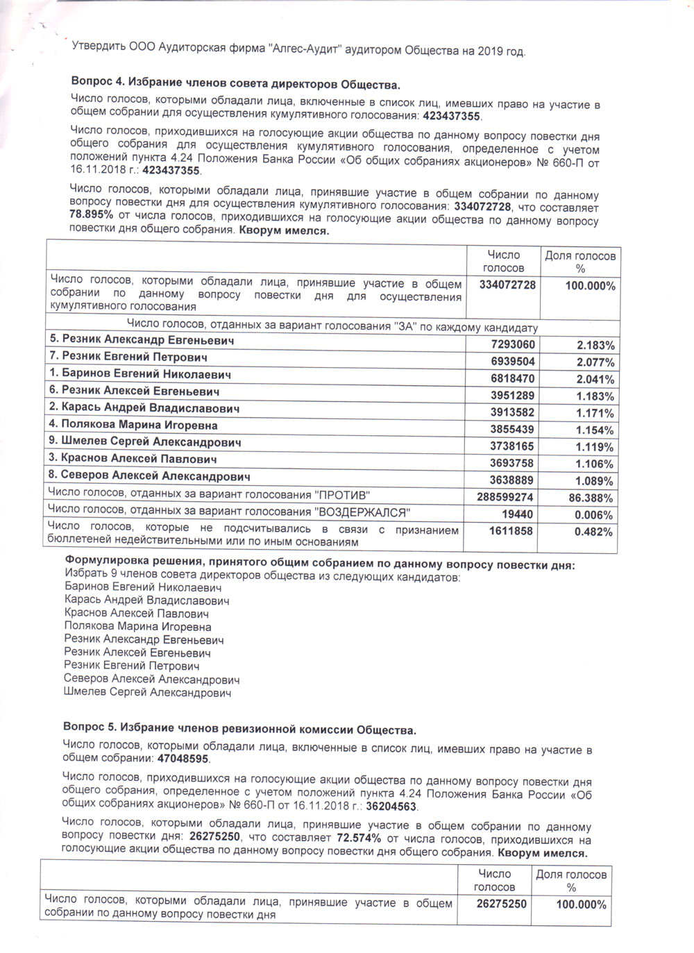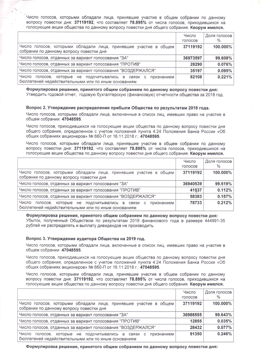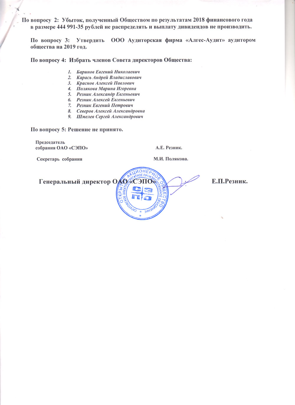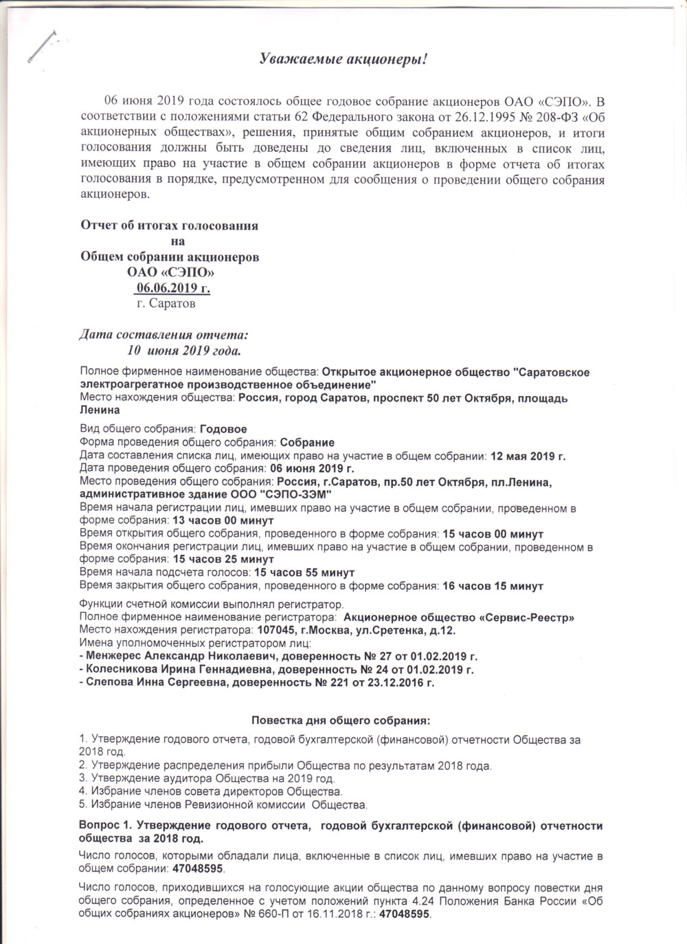 Отчёт об итогах голосования на общем собрании акционеров ОАО «СЭПО» 06.06.2019